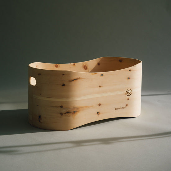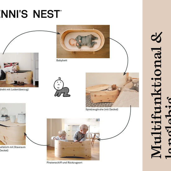 BENNI’S NEST Preloved Produkte werden sorgfältig von uns aufbereitet, renoviert und sind dadurch wie neu. Unser multifunktionales Babybettchen ist der beste Begleiter für eine geborgene Reise ins Land der Träume: Das TÜV-geprüfte Nestchen aus duftendem Zirbenholz sorgt für ideale Luftzirkulation und hat eine schützende, organische Form, die es noch gemütlicher macht. Danach kann es durch eines unserer Accessoires als Beistelltisch, Sitzbank oder Truhe weiterverwendet werden. BENNI’S NEST Babybetten werden per Hand, ganz ohne Metall- und Kunststoffteile, gefertigt und in einem Stück geliefert, sodass keine weitere Montage nötig ist.